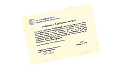 Axon has received renewed certification from ESA (European Space Agency) as supplier of wires & cables for space applications. This for general wires such ESCC 3901/012 with its cross linked ETFE insulation, better specified types like ESCC 3901/018 with Celloflon®/Polyimide/PTFE insulation as well as shielded 100 ohm twisted pair high speed data cable certified to ESCC 3902/004 Low Mass SpaceWire .